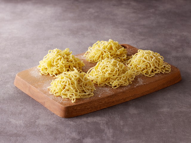 快笑の生麺の特徴として保存料を使用していません。 生中華ちぢれ細麺は小麦粉に、かんすい、塩、クチナシ色素を使用しています。 普通に冷蔵していると、3日で生麺にカビが生えてしまうので、オゾン(酸素原子)を使い原材料の小麦粉に含まれる菌を減らす製法により、賞味期限10日(冷蔵5°C以下)としています。 あえて賞味期限を延ばさないのは、完全殺菌をすると脱臭と脱色効果により、小麦の風味がなくなってしまうからです。 お早めにお召し上がりになれない場合には生ものですので冷凍保存していただきますようお願い申し上げます。 1袋1袋大切に製造しています。 くれぐれも冷蔵保存でカビが生えて廃棄するようなことにならないよう取り扱いには十分ご留意ください。 練り具合やカットによって同じ原材料でも幾通りの麺が出来上がります。 いろんな生麺の日本一があっていいと思いながら、一番美味しいというのはずっと追求するものだと思っています。 茹で時間のかからない生麺を朝食でもお楽しみいただけると嬉しいです。 <茹で方のポイント> ●お湯を沸騰させて麺を投入します。※塩茹でしません。原料に塩が含まれています。 ●生パスタの茹で時間は2分から ※柔らかめが好きな方は4分程度がおすすめです。 ●生中華ちぢれ細麺の茹で時間は2分30秒 ※固めが好きな方は2分程度がおすすめです。 茹で伸びしにくいので茹で時間によって多様な固さの麺が楽しめます。 ●冷凍した場合 ・自然解凍してから茹でる。 ・そのまま茹でてお湯の中でほぐす、のどちらでもお楽しみいただけます